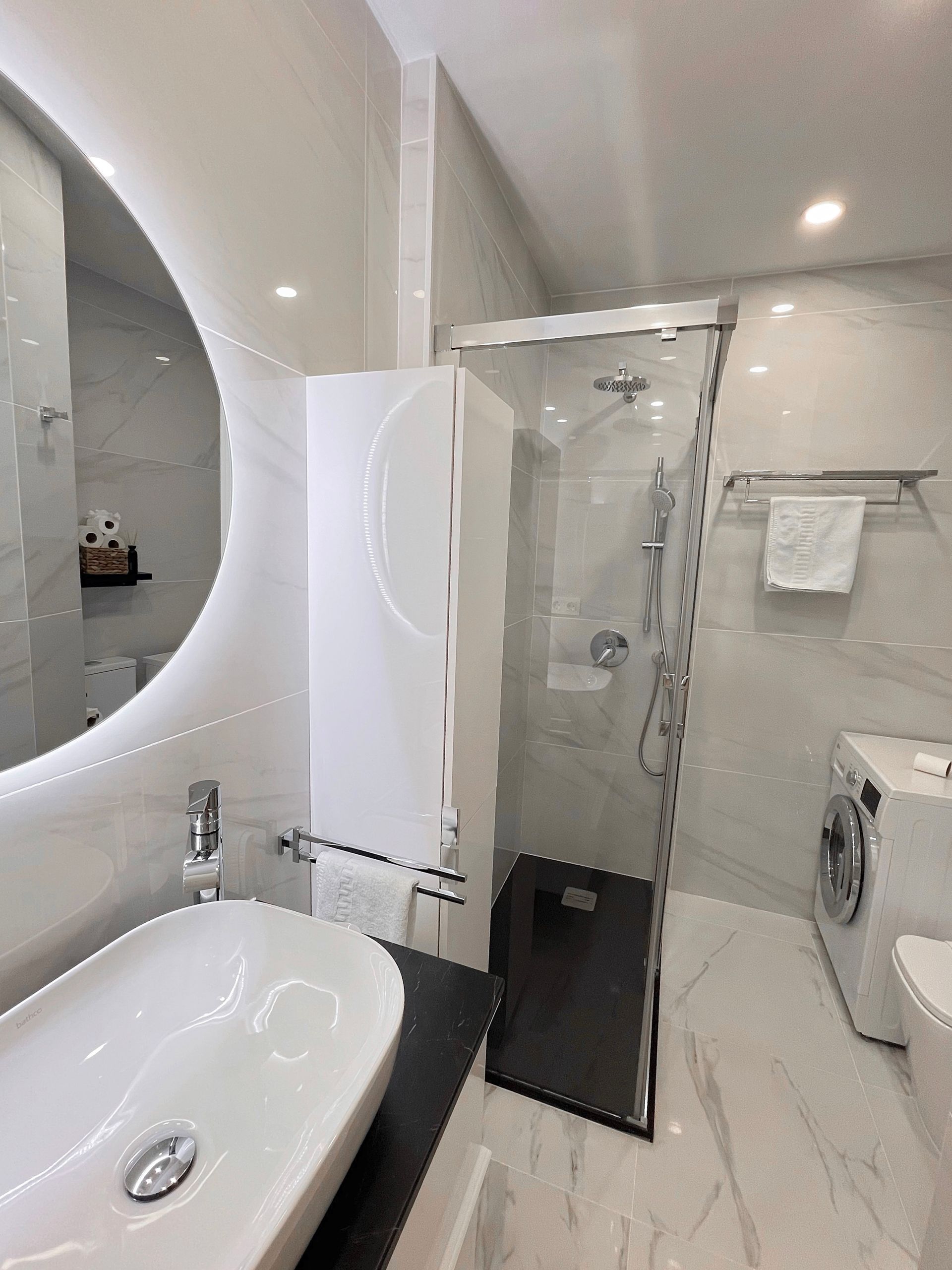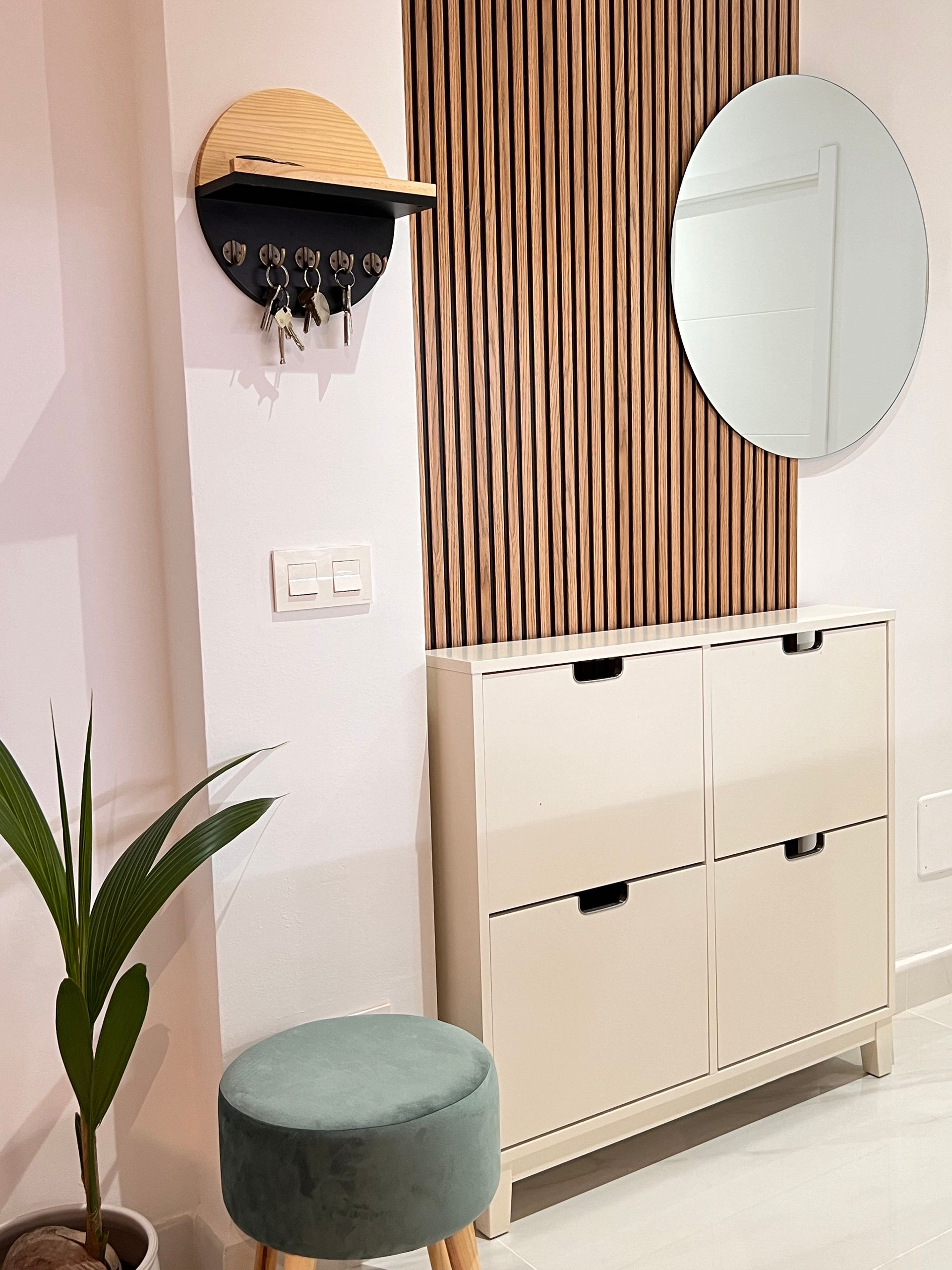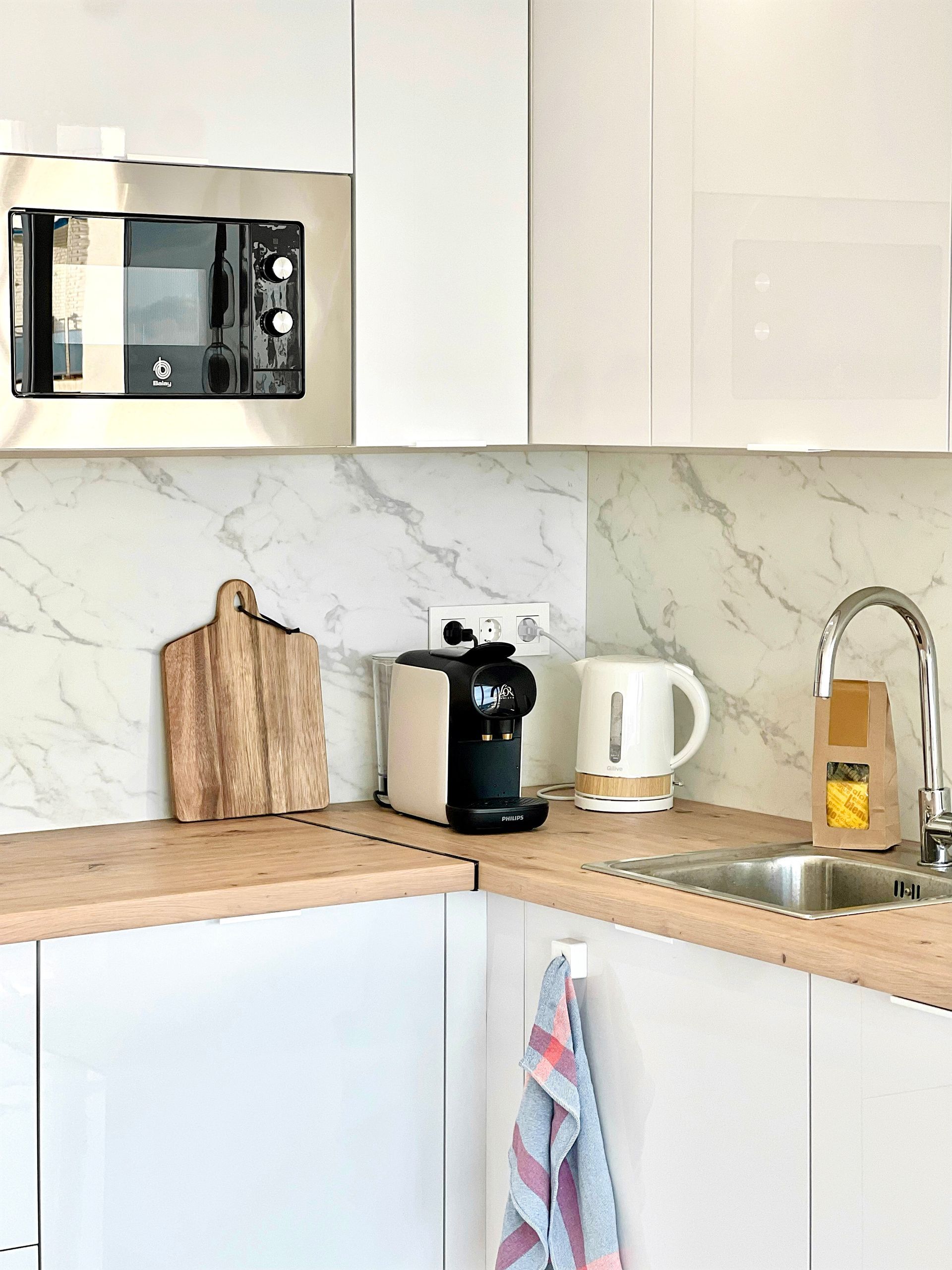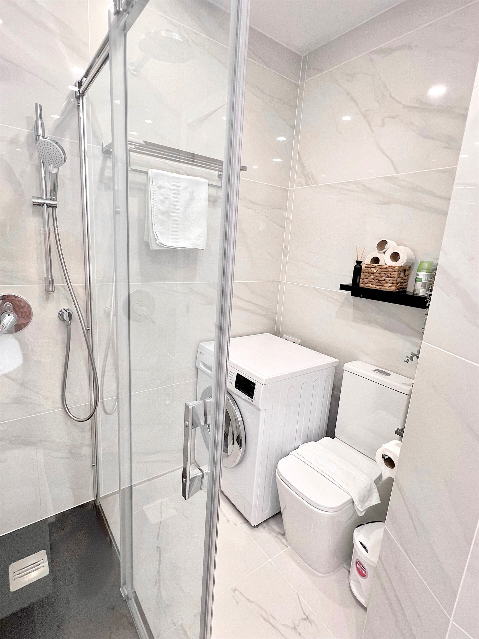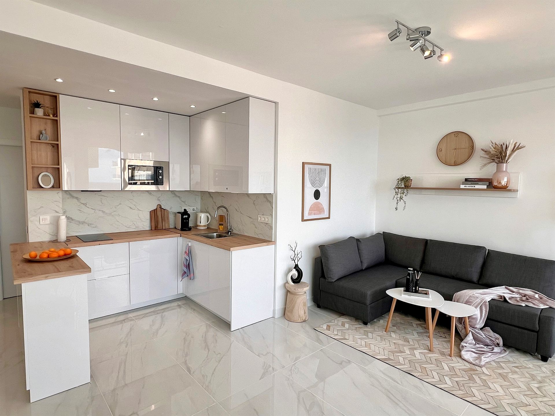 Modern, light and airy, recently refurbished in light colors that will make your stay calm and relaxing, open plan well stocked kitchen with all appliances, should you fancy to cook and bathroom with large walk in shower.